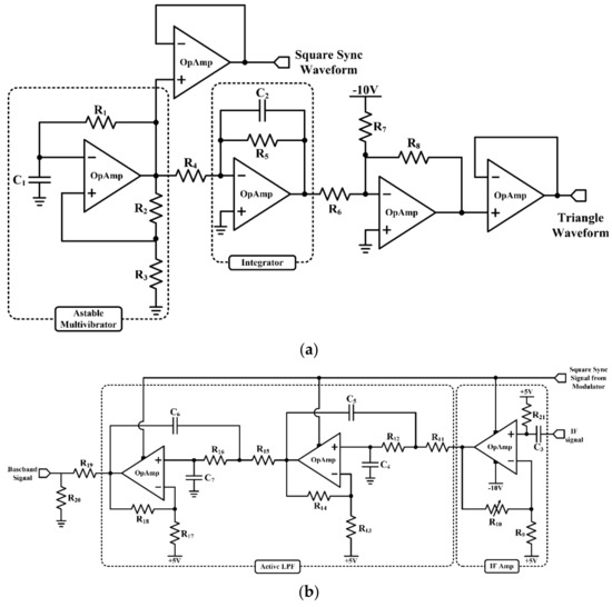 (a) Designed frequency modulator (FM) and (b) baseband circuits.