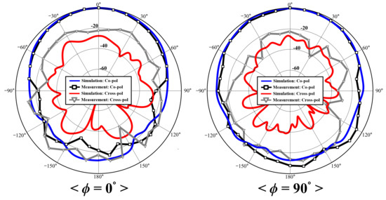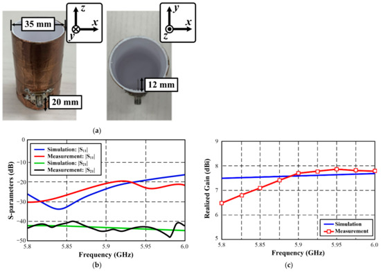The cylindrical horn antennas used in the proposed system were designed based on the dominant-mode analysis. A commercial product package was used to this end, and it was metalized using a copper tape, as illustrated in Figure 4a. The simulations were performed using the Ansys HFSS 2021 R2 package. The horn antennas measured 35 88 mm (diameter height), and they operated in a single dominant TM11 propagation mode in the 5~6.6 GHz frequency range. A 12 mm-long feeding probe was mounted 20 mm away from a shorting wall. All antenna parameters were measured inside an anechoic chamber. The measured antenna S-parameters cover the required operation frequency band of 5.83~5.94 GHz, and the isolation between the Rx and Tx antennas equals 40 dB when the distance between them equals 12 cm (Figure 1b and Figure 4b). The measured antenna gain values lie in the 6.8~7.8 dB range, and the cross-pol suppression level exceeds 20 dB at the rated operation frequency (Figure 4c). Figure 5 depicts the observed radiation patterns in the E- and H-planes (ϕ = 0° and ϕ = 90°, respectively). All measurements demonstrate good agreement with the simulation results.