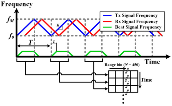 where f0 and fM denote the lowest and highest frequencies, respectively, and K denotes the time rate of increase of the triangular wave. As described in (3), the received signal frequency (fR) is delayed by τ = 2·R/c where R denotes the distance between the radar and detection target and c denotes the speed of light (c = 3 × 108 m/s).