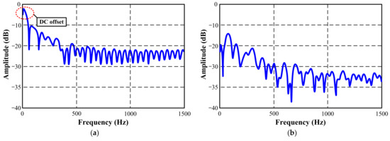 Amplitude of received signal in frequency domain (a) with and (b) without DC offset.