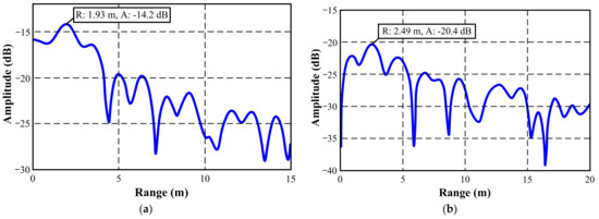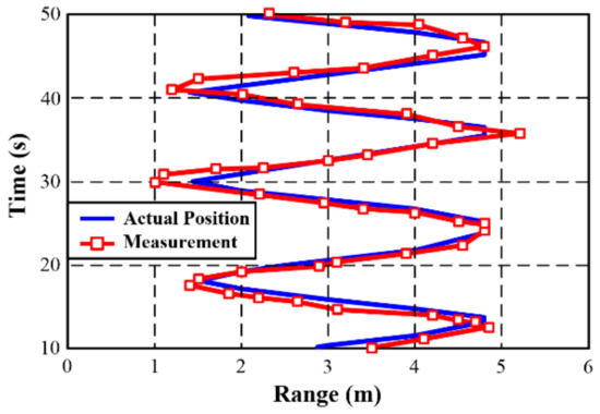 Figure 8 depicts plots of the measured and actual positions of a metallic object in the range–time space. In this study, the piecewise cubic Hermite interpolating polynomial (PCHIP) was employed to extract distance data from the measured range bin. As observed, the average range error equals 0.37 m, which is less than the distance resolution.