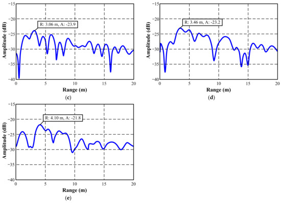 Through-wall object-detection results: (a) R = 2 m, (b) 2.5 m, (c) 3 m, (d) 3.5 m, and (e) 4 m.