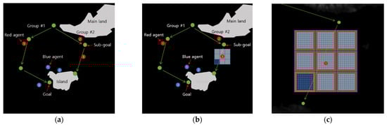Figure 1 illustrates the 3:3 multi-agent environment. The upper layer expresses an actual total area of 40 km × 40 km into a 2D grid with 40 × 40 cells. The lower layer divides the total area of 40 km × 40 km into 30 × 30 cells for learning: 3 × 3 cells (3 km × 3 km) in the upper layer corresponded to 10 × 10 cells (1 km × 1 km) in the lower layer. In Figure 1a, the red agent adopts the method proposed in this paper. The blue agent is an opponent to compete against. The green dots denote sub-goals or goals. To consider the diversity in the path of action of a red agent, several agents are grouped, and the relevant path is indicated using sub-goals and a goal. A group for each agent was designated in advance for every episode. Each red agent also has its own sub-goals and a goal. In Figure 1a, the green dot to which an agent finally arrives among the green dots is the goal. Other green dots represent sub-goals. When such an environment is presented, a red agent aims to arrive at the final goal by passing the predefined sub-goals and avoiding blue agents. The final action to be implemented is determined and executed by each red agent using this system.