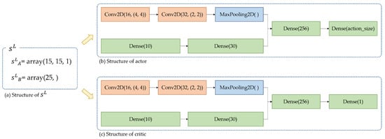 Figure 3 shows the actor and critic structure of A3C using the proposed method. Both the actor and critic state as the input. is divided into and . indicates that the data on 15 15 cells around a red agent are available for transfer (0) or not (I) in the arrangement of (15, 15, 1). calculates and indicates the distance to a blue agent and location, as well as a goal in the arrangement of (25). Of the 25 states, 10 states are related to a goal, and the other 15 states are related to a blue agent.