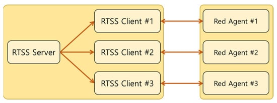 The full system was configured as shown in Figure 4. The real-time strategy simulation (RTSS) server controls and manages the entire game and the RTSS client. The simulation client performs simulation as interworking with a red agent. The RTSS server, RTSS client, and a red agent act on each computer.