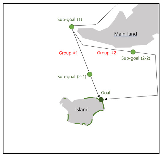 The experiment used a 40 km 40 km map, including Baengnyeongdo Island. The red agents started from the top right direction and aimed to arrive at Baengnyeongdo Island. In this process, the red agents received the case data generated on the basis of 55 types of cases selected by experts and attained the goal of passing sub-goals in sequence. Only one case was used in the experiment. The route in the designated case is marked by a solid black line in Figure 5. The light green and dark green dots indicate sub-goals and goals. The green edges on the island are the places that the red agents could arrive. Red agents were divided into groups #1 and #2 to move toward the goal.