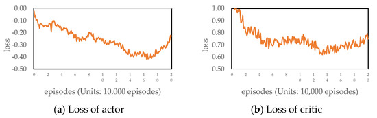 Change of loss depending on the number of learning using the proposed approach: (a) loss of actor, and (b) loss of critic. The x-axis is number of episodes (units: 10,000 episodes) and the y-axis is loss.
