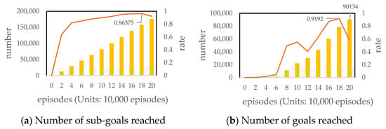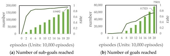 Cumulative number of goal and sub-goals reached depending on the number of learning using the proposed approach: (a) number of sub-goals reached, and (b) number of goals reached. The x-axis is number of episodes (units: 10,000 episodes), the left y-axis is number of sub-goals/goals reached, and the right y-axis is reach rate.