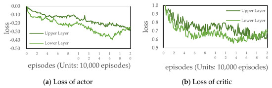 The changes in loss and cumulative number of successes using the traditional double layered A3C were analyzed. Traditional double layered A3C adopted a double layered approach and applied A3C to each layer. Figure 8 illustrates the change in loss depending on the number of learning cycles using the double layered A3C. Compared with Figure 6 in Section 4.4, in the case of the lower layer, the trend of the loss is similar; however, in the case of the upper layer, the loss of the upper layer was not minimized with 200,000 episodes.