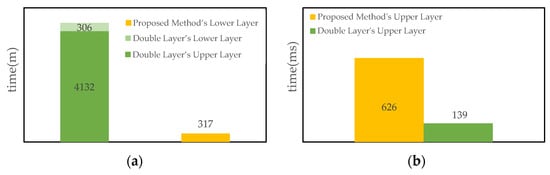 Figure 10b compares the calculation time in the upper layer using the traditional double layered A3C and our algorithm. Since the traditional double layered A3C applied the weighed values that were learned before, the calculation time was 139 ms on average. Meanwhile, our method decided values in the upper layer after calculating the average of values in the lower layer, and the average calculation time was 626 ms, which was 4.5 times longer than that in the upper layer using the traditional layered A3C.
