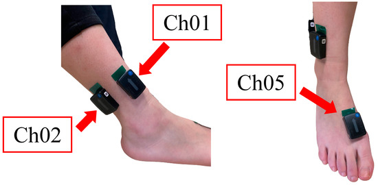 Ch01 is sensor 1 placed on the surface where the EDL muscle is located. Ch02 is sensor 2 placed on the surface where the soleus muscle is located. Ch05 is the accelerometer placed on the dorsum of the foot between the first and second metatarsals.