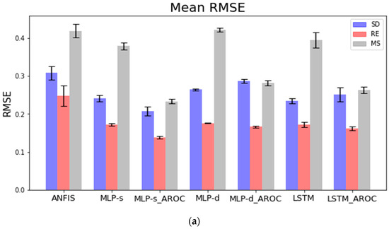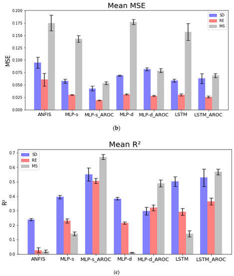 Training and evaluation were performed 10 times for all models. Bar chart shows the mean and standard deviation of RMSE, MSE, and value of each NN model for test subjects SD (purple), RE (orange), and MS (gray). Based on the bar chart (a–c), the results show that ANFIS had the least accuracy compare to other models. Bar charts (a,b) show LSTM_AROC and MLP-s_AROC had the least error, while (c) shows LSTM_AROC and MLP-s_AROC had the highest value.