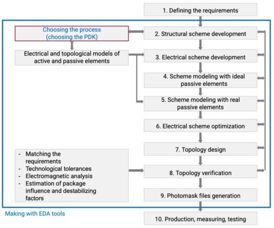 At present, monolithic microwave integrated circuits (MMICs) are designed and produced using electronic design automation (EDA) tools (Figure 1) [1,2,3]. Large factories offering MMIC production services (called foundries) must provide their customers with a process design kit, so that the customers can design MMICs for their own applications.