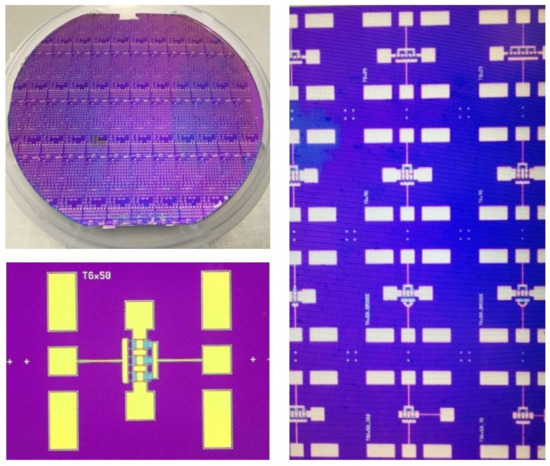 Then, GaAs pHEMT wafers were produced and processed. Each wafer consists of repeated frames (Figure 3) that include: