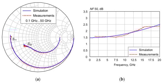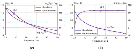 A comparison between measured and simulated S-parameters, and 50-ohm noise figure for a 4 × 50 μm pHEMT at the bias point Vds = 3 V, Ids = 20 mA: (a) S11—input reflection coefficient, S22—output reflection coefficient; (b) 50-ohm noise figure; (c) S21—small-signal gain; (d) S12—reverse transmission coefficient.