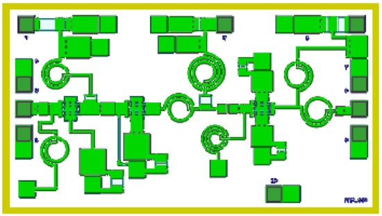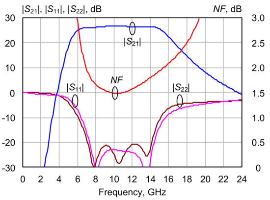As an example, the electrical scheme, designed topology, and simulated S-parameters of the three-stage LNA are shown in Figure 10, Figure 11 and Figure 12, respectively. The main parameters of MMIC, obtained through simulation, are presented in Table 3.
