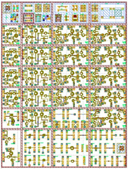 The three developed LNAs were included in the production frame along with the line fragments, test structures, and process supplement symbols (Figure 13).