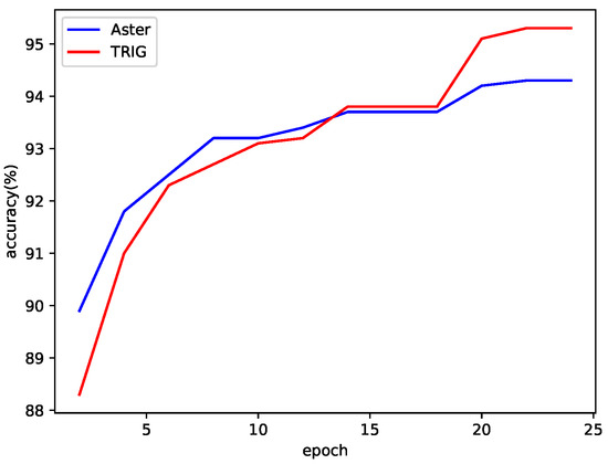 The accuracy on IIIT between TRIG (Ours) and ASTER during the training process.