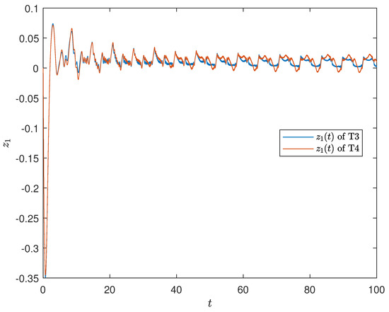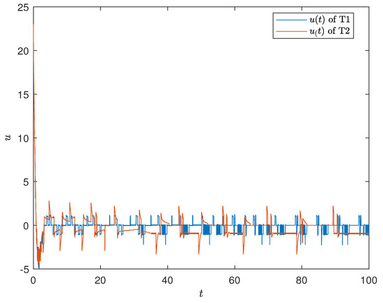 The results of Testings T1–T2 are shown in Figure 4, Figure 5 and Figure 6, which illustrate the tracking performance of Testings T1–T2 and their inputs, respectively. From Figure 4 and Figure 5, the closed-loop system works well and is stable under the designed control approach in spite of strong uncertainties. Moreover, the system responds quickly to the desired steady-state value and converges into a small neighborhood around it whether using uniform quantizers or logarithmic quantizers, which validates the effectiveness of the proposed method on a stabilization mission.