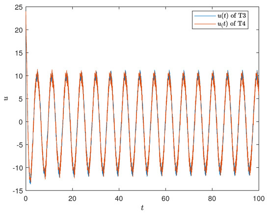 Figure 7, Figure 8, Figure 9 and Figure 10 display the results of Testings T3–T4. Based on Figure 7, Figure 8 and Figure 9, the responses of the system to a sinusoidal signal are all stable regardless of employing uniform quantizers or logarithmic quantizers. In addition, although strong disturbances are applied to the system, the stability of the system is not very affected, and the adaptive laws help the closed-loop system achieve a better performance over time. These results verify the effectiveness of the proposed method on a tracking task.
