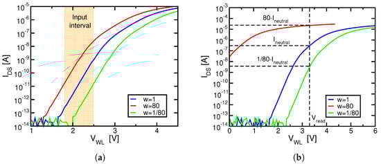 As shown in Figure 1a, by changing cell it is possible to modulate at a given and, therefore, the cell synaptic weight, with positive and negative leading to and , respectively. Even though the synaptic weights could in principle assume analog values, their tuning resolution is ultimately limited by charge granularity, becoming relevant especially in very scaled devices []. In addition to this, an upper limitation for them is needed to keep the cell from exiting the subthreshold regime. In fact, according to the PAM mode the input weight synaptic multiplication is implemented thanks to the exponential law of Equation (1), and the polynomial characteristic of cells operating in the on-state regime would not allow such a behavior. For the same reason, once a maximum synaptic weight is chosen, also an upper bound for must be selected. It follows that only a small portion of the curve can be exploited, resulting in a limited acceptable range.