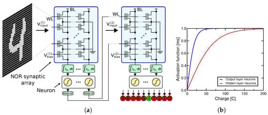 (a) Schematic of the NOR Flash-based neuromorphic digit classifier investigated in this work when PWM is employed (adapted from [], © 2019 IEEE). (b) Activation functions used for the neurons in the hidden and output layers; different scaling parameters were chosen to match the different dimensions of the respective NOR Flash arrays.