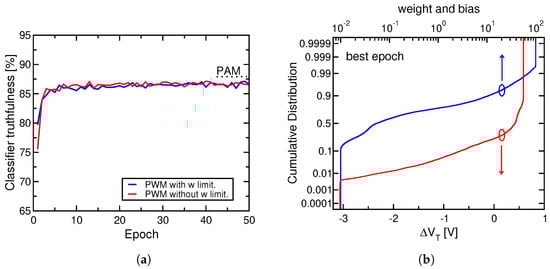 Figure 3a shows the recognition truthfulness of the PWM-based classifier during its training with the standard stochastic gradient-descent method based on the backpropagation algorithm [] (blue curve), compared to the final value resulting from the classically adopted PAM approach. In both cases, a cross-entropy error function, a mini-batch size equal to 10 and a learning rate equal to 0.01 were adopted []. When no noise source are taken into account, the PWM and PAM schemes are practically equivalent from the performance standpoint at the end of the training phase, confirming the validity of the former. The red curve in Figure 3a, on the other hand, refers to the simulation results achieved with the PWM approach when the synaptic weights are forced in the interval ; this means that if () results from the network training, its value is clamped to (). Since no relevant variations in the classifier truthfulness are observed, this limitation will be safely applied to all the results presented in the following, allowing to limit for each cell in the interval [3 nA, 30 μA].