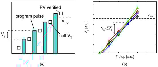 The program operation in NOR Flash memory arrays is based on a P&V scheme relying on ISPP. According to it, each memory cell is set to an erase state first, (i.e., with a very low-). Then, a program pulse with WL and BL voltages equal to (, ) is applied, triggering channel hot-electron injection into cell floating-gate that makes cell increase. Right after the program pulse, cell is read (this is referred to as verify phase) and compared with a target level . If is lower than , another program pulse is applied to the cell, with the WL voltage increased by a quantity , that is . This procedure is repeated until the condition is verified, with ( represents at the i-th step and ), when the program phase stops. It can be shown that, after a sufficiently large number of pulses, the average variation for each cell due to each programming pulse is exactly equal to and the final cell is expected to be in the range [,]. This is shown schematically in Figure 4a, where each vertical rectangle corresponds to a programming pulse with of increasing amplitude and the white squares represents the increasing cell .