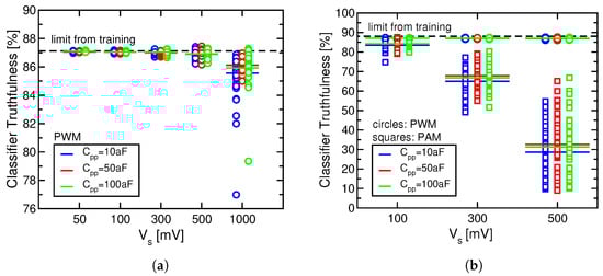 (a) Simulated classifier truthfulness in presence of to PN for different values of and when PWM is employed; for each condition, 50 consecutive simulations were performed (average values are indicated by horizontal lines). (b) Same as (a) but with the data points resulting from the adoption of the PAM scheme.