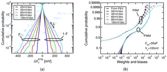 Even though ISPP allows a cell tuning precise enough to keep network truthfulness degradation very limited, any source of instabilities may still compromise the classifier performance at later times. In NOR Flash memory arrays a major source of instabilities is represented by RTN, which arises from the capture and emission of electrons in tunnel-oxide traps. Both the amplitude and the timing of RTN-induced fluctuations are non-deterministic, therefore RTN is usually addressed by looking at the statistical distribution of the difference between two consecutive read operations () [,,]. As shown in Figure 6a, a clear signature of the cumulative distribution is its exponential tails; its slope , which is taken as the most representative RTN parameter, can be shown to approximate the single-trap fluctuation amplitude [,,] and increases when single-cell dimensions are shrunk down. The remaining parameters describing RTN are the average number of traps per cell , which determines the height of the RTN tails, and the capture and emission trap time constants, which are typically uniformly distributed over the logarithmic time axis.