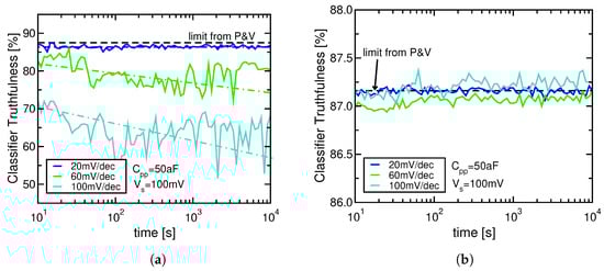 Calculated classifier truthfulness in presence of RTN with increasing values of for (a) PAM (dashed-dotted lines highlight the average reduction in performance over time) and (b) PWM. and were assumed for the program phase.