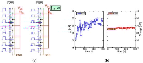 To further confirm our results, we performed a wafer-level experimental test involving a NOR Flash array test structure with 8 WLs and 1 BL (see Figure 8a). The 8 memory cells along the BL were programmed by ISPP with to values corresponding to weights uniformly distributed in the [1/80,80] range; each memory cell was then associated with an input signal randomly drawn in the [0,1] range. With all the input signals simultaneously applied to the WLs, the output signal was monitored for 300 s following the program phase. Results are reported in Figure 8b, for the two cases in which the experiment is carried out employing the PAM and PWM encoding schemes. As expected, PWM assures superior performance in terms of output signal stability, which is reflected in a very low RTN-sensitivity in those large-scale ANNs based on larger NOR Flash memory arrays.