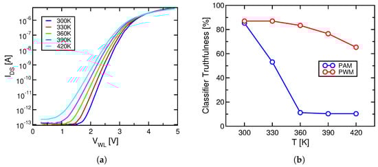 Another source of truthfulness instabilities is represented by temperature variations that may occur after the program phase, affecting the synaptic weights and, therefore, the classifier operation. To investigate this point, we measured the single-cell transcharacteristic already shown in Figure 1 not only at 300 K, but also at temperatures as high as 420 K, as shown in Figure 9a. Then, assuming the training phase in our network to take place at 300 K, the impact of temperature variations on the classifier behavior was accounted for by transforming the curve of each NOR Flash memory cell in agreement with Figure 9a, and testing the network accuracy at the remaining temperatures. Note that the impact of PN on each cell resulting from program was considered negligible to focus just on the role played by temperature variations.