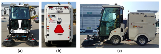 The recent advances in road sweeper developments can be categorized into two aspects: The first is an electrification, which was developed in order to cope with environmental issues [4,5,6]. Up until the 2000s, most road sweepers used a diesel engine as their power source, which resulted in the creation of air pollution due to emissions of compounds such as NOx and particulate matter [7]. To cope with this problem, the diesel engine in road sweepers was replaced with an electric motor and a battery. The second is autonomous driving, which we developed in order to maximize utilization in dedicated areas such as airports or public parks without a human driver [8,9,10]. For example, most passenger vehicles are utilized within 20% of their total lifecycle. On the contrary, autonomous road sweepers can be utilized by up to 90% because there are no human drivers [11]. Moreover, they can be operated from late night to dawn by virtue of autonomous driving. Another purpose of autonomous driving for road sweepers is to protect sanitation workers from injury caused by traffic accidents and to free them from heavy physical labor. This type of vehicle is referred to as an autonomous electric road sweeper (AERS).