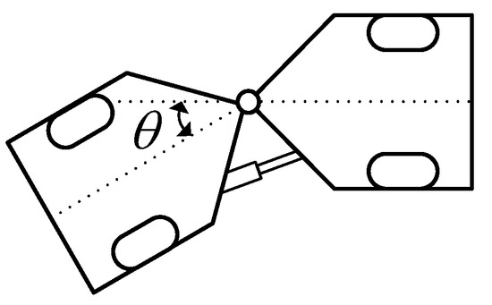 Generally, a small-sized road sweeper, such as the one seen in Figure 1, has articulated frame steering (AFS) as a steering mechanism [16,17]. Figure 2 shows the structure of AFS. As shown in Figure 2, the vehicle consists of the front and rear bodies. In Figure 1, θ is the articulation angle at the center joint. In this type of vehicle, steering is achieved by changing the articulation angle using the hydraulic cylinder between the front and rear bodies. This type of steering has generally been adopted in construction machines such as wheel loaders, scrapers, loaders, and skidders [18,19]. Boschung’s Urban-Sweeper S2.0 as well as the KIIT and AMSV’s AERS have this type of a steering mechanism as well, i.e., AFS. By virtue of its structure, a vehicle with AFS has excellent maneuverability, i.e., agility, which can provide a faster yaw rate with respect to an identical steering angle. Moreover, it can provide a smaller turning radius on a single lane road [16]. However, this means that larger lateral acceleration can be generated by a smaller steering angle compared to front-wheel-steered vehicles. Another drawback of AFS is the snaking instability phenomenon that occurs at high speeds [18].