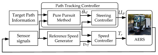 For autonomous driving, several functions are needed. These functions include localization, path generation and tracking control, speed control, obstacle detection and avoidance, and autonomous parking [20,21]. In view of control, path tracking and speed controls are the most important aspects [8]. Path tracking control means that the driver model, which generates the steering angle command, needs to follow a given path [9,10,21,22,23]. The speed control ensures that the vehicle follows a given speed profile by means of engine throttle or motor torque commands [8,9]. The pure pursuit method is implemented as the patch tracking controller in AERS, as shown in Figure 1. The speed controller is designed with a sliding mode control and is implemented into AERS, as shown in Figure 1.