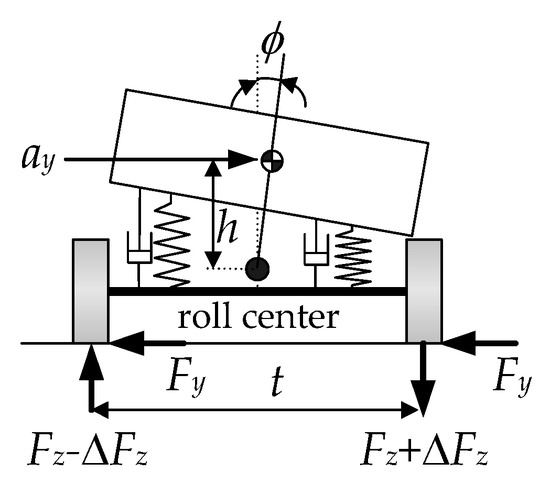 Generally, the roll motion of a vehicle is caused by the lateral acceleration, which is generated by cornering. Figure 5 shows the roll motion of a sprung mass caused by the lateral acceleration ay, which is calculated using Equation (4). In Figure 5, h is the height of the mass center from the roll equation, and t is the track width. The roll center of the rear body of the AERS is located on the axle because it has no suspension. As such, the height of the mass center of the rear body is larger than that of the front body. The lateral acceleration causes lateral load transfer, which is represented by the vertical force variations, Fz − ∆Fz and Fz + ∆Fz, as shown in Figure 5. The larger the lateral acceleration and the height of the mass center, the smaller the track width, and the larger the lateral load transfer. The rollover condition is defined when the vertical tire force of a wheel becomes zero, which means that the wheel loses its contact on the ground.