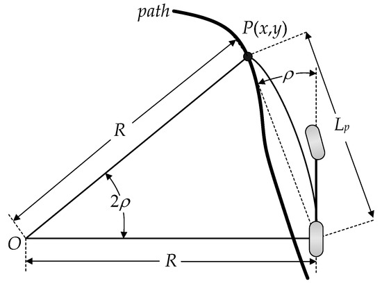 In this paper, a pure pursuit method is adopted to generate the articulation angle of the AERS. Figure 6 shows the geometry for the pure pursuit method [34]. In Figure 6, P(x,y) is the target point, and ρ is the angle between the vehicle’s heading vector and the look-ahead one. Lp and R are the look-ahead distance and the radius of the circular arc, respectively. In the pure pursuit method, the steering angle or the articulation angle is only determined with P(x,y) and ρ. From Figure 6, the curvature κ of the circular arc connecting P(x,y) and the rear wheel is calculated as Equation (19). With the definition of κ, the reference articulation angle is calculated as Equation (20) [34]. In Equation (20), L is the wheelbase, i.e., the distance between the front and rear axles. This articulation angle is fed into the steering controller.