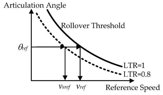 The second method uses the rollover threshold represented by the combination of the reference speed and the articulation angle. Figure 7 shows typical rollover thresholds. The values on the solid and dotted lines in Figure 7 mean that LTR is 1 and 0.8, respectively. With the rollover threshold or the solid line in Figure 7, the reference speed, vref, needed for rollover prevention can be obtained from the rollover threshold if the articulation angle, θref, is given. However, it can cause the rollover if the reference speed is obtained from the solid line. As such, it is preferable to select vsref as the reference speed from the dotted line in Figure 7. The reference speed, vsref, is used as vx,ref in Equation (25). This method will be referred to as Method#2.