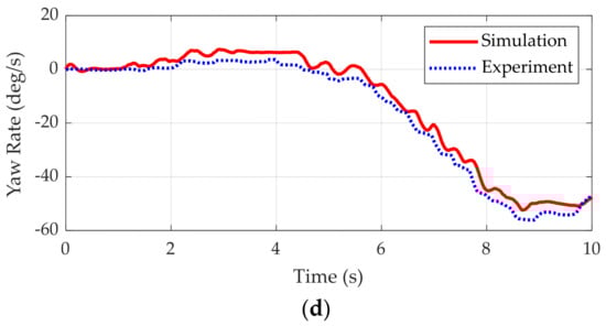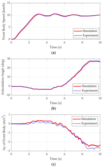 Figure 8 shows the simulation results of the vehicle model and experimental data. In Figure 8a,b, the red solid lines represent the reference articulation angle and the reference speed measured from experiment, respectively. As shown in Figure 8a,b, the vehicle model with the speed and steering controllers can follow the reference speed and articulation angle. As shown in Figure 8c,d, the simulation results of the vehicle model, i.e., the lateral acceleration and the yaw rate of the front body, are well fitted with the experimental data. From these results, it can be shown that the vehicle model implemented in MATLAB/Simulink is valid for use in the simulation.