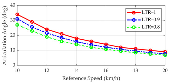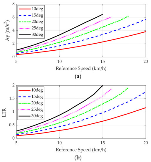 Figure 9 shows the simulation results of open-loop steering under constant speed. In Figure 9b, it can be regarded that the AERS rolls over if the LTR is larger than 1. For example, if the reference speed is set to 15 km/h and the reference articulation angle is set to 15°, then the AERS will roll over because the LTR is 1. The corresponding lateral acceleration can be found in Figure 9a. For the example, the lateral acceleration is about 3.5 m/s2. These results are summarized in Table 2 and Figure 8.