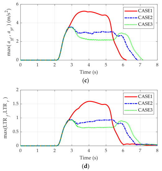 Figure 11 and Figure 12 show the simulation results and control inputs for each case, respectively. As shown in Figure 11a, the AERS follows the given path well, regardless of the use of the rollover prevention scheme. The maximum offset from the reference path is 0.361 m. As shown in Figure 11b,c, the rollover prevention scheme was activated when the lateral acceleration became larger than 3.0 m/s2. Through the rollover prevention schemes, the reference speed decreased to 11 km/h for CASE2 and to 9 km/h for CASE3. As shown in Figure 11b, the speed controller can follow the reduced reference speed. As a result, the lateral acceleration and LTR were reduced to 3.0 m/s2 and 0.9, respectively. After cornering, the rollover prevention scheme was deactivated, and the reference speed increased to the original value. As shown in Figure 8, CASE3 shows the best performance for rollover prevention because it generated the lowest reference speed.