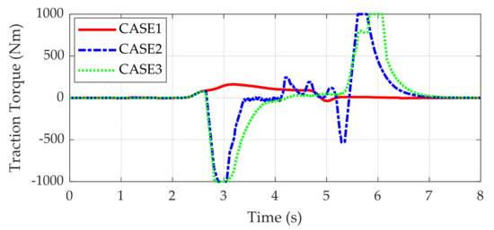 In Figure 11b, the convergence speed of the vehicle speed to the reference one can be accelerated by increasing the gain Kv in (24). In this simulation, Kv was set to 5. However, the larger the gain Kv, the larger the chattering in the traction/braking torques. As such, it is not recommended that Kv is set to a larger value of about 10. For CASE2, there is small chattering in the traction torque, as shown in Figure 12. This is caused by the fact that the lateral acceleration was fed into the reference speed, as given in Equation (28). On the contrary, for CASE3, there is smaller chattering in the traction/braking torque because the lateral acceleration or LTR was not fed into the reference speed. As such, CASE3 is preferable to CASE2 in view of durability.