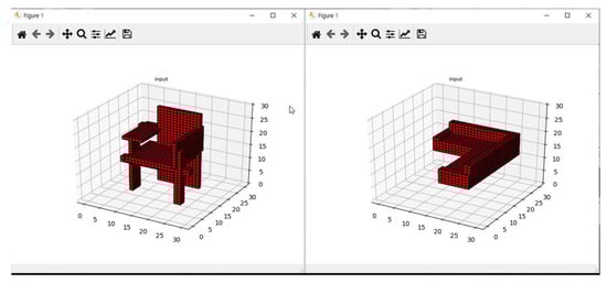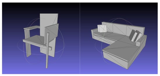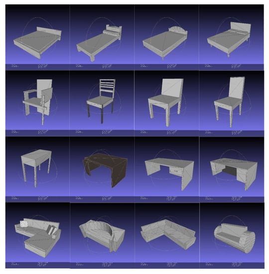 For the study of the 3D geometry generation model, Princeton Modelnet10 [] was used as the data. Princeton Modelnet10 is divided into 10 categories for interior furniture and is a text file with only pure vertex position and face index information. In this study, for considering the performance of Multilayer Perceptron (MLP) learning and the system limitations, 64 geometry instances with less than 300 vertices were used as training data among about 900 Modelnet10 data, as shown in Figure 11, and 16 instances were used as test data. Even if only 300 vertices are converted to Matrix, 90,000 input nodes will be obtained. The number of input nodes on MLP used in the experiment was limited to 126,000 (300 × 420) of .