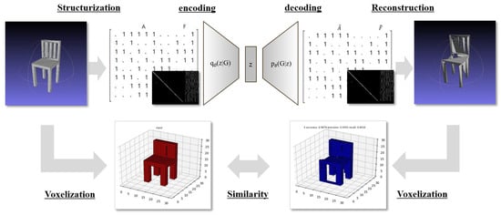As shown in Figure 2, we constructed a framework dedicated to geometry to learn polygonal geometric data. The first structurization is a step to structure unstructured geometric data into a structured data matrix and then train the structured matrix as input data through VAE, a generation model, and finally reconstruct the learned output data into geometry. Since it is not easy to grasp the reconstruction performance in the geometrical shape, in order to understand the learning performance, the initial geometry before structurization and the geometry that was reconstructed were respectively voxelized. By comparing the similarity of the corresponding voxel type, the performances for learning and generation were identified. Each step is described in more detail below.