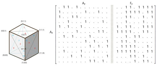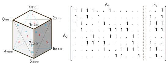 Vertex Adjacency (). To create each piece of face information in an that contains only vertex and vertex edge information, it was necessary to find the total number of faces and the three points constituting each face. When we mapped the column and row values of 3 vertices of the cube blue triangle (Figure 9) in the vertex adjacency matrix (), we found a rule for grouping the three points constituting the face (triangle) in the form of a right triangle. We found that the three points that make up this triangle are the three points that make up one face. Since the matrix has a symmetrical shape around the diagonal, the face information was extracted only at the top of the gray area. However, among the information was a case where some incorrect faces that did not exist as actual faces were created, such as the red triangle in Figure 9. However, it was impossible to distinguish incorrect information, such as a red face in the generated matrix, and since the face was an internal face in the overall shape, it was not a subject of great consideration from the perspective of the overall shape.