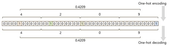 Vertex Feature (). Essentially, the most important information among vertex features in geometry is position (X,Y,Z). In order to generalize various sizes for each geometry type, the vertex position was generalized to a size of 0 to 1. All positions were expressed as real values to 4 decimal places (0.0001 to 0.9999) between 0 and 1. However, for accurate real value encoding, each digit number was expressed as one hot encoding. Accordingly, to store each value of X, Y, and Z, each of 40 binary values for a total of 120 vertex features were expressed; see Figure 6.