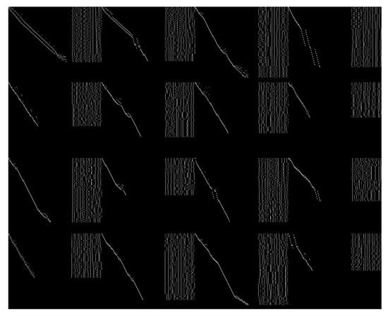 Vertex Adjacency (). In general, the geometry surrounded by the surface has the form of a vertex with position information, a face consisting of three vertices, and a polygon, a surface, and a geometry as a group of faces. Vertex and edge information connected to each other can be extracted from Geometry, and it has two to six connected vertices for forming a surface. In general, in the order of the vertex index, there is a connection relationship, and as shown in Figure 3, the vertex adjacency () matrix has diagonally sparse data. The size of the matrix (300) is greater than the number of vertices of the geometry with the most vertices (296), and it has a value of 1 if the horizontal vertex index and the vertical vertex index are connected, or 0 otherwise. The meaning of the horizontal and the vertical is the same, and it always has a symmetrical shape based on the diagonal. Unlike the existing graph data, as shown in Figure 3, the vertex adjacency () matrix has no value in the same horizontal and vertical index because the value of 1 represents the edge of two points. However, this matrix is expressed only with edge information; the surface information is missing and only the wireframe information is available.