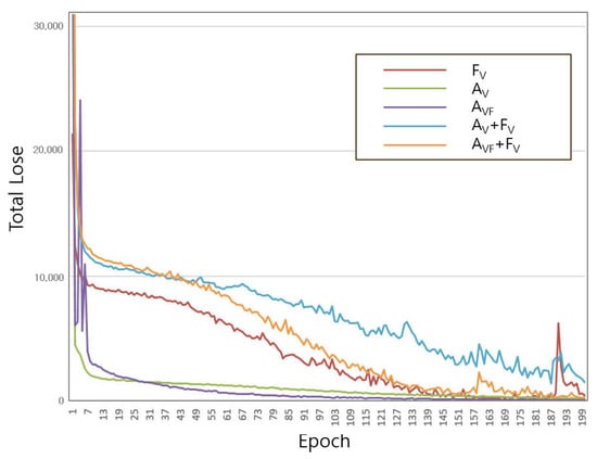 In the comparison of total training losses shown in Figure 12, it can be seen that and learning-only adjacency learn much better than the learning-only feature. Here, it was confirmed that the sparse adjacency matrix is more effective in learning than the one hot encoded feature information. Of and , it was confirmed that was more effective in learning, and with vertex*face information learned better than vertex-based adjacency.