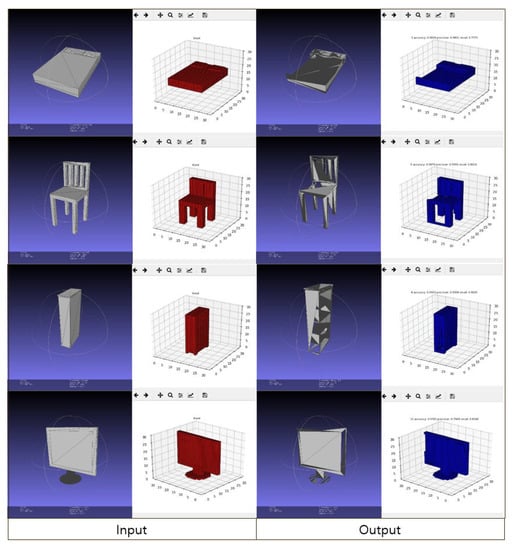Figure 13 shows the input geometry of test data and the generated output geometry for . The dark face of the output geometry is caused by the reverse application of the normal vector direction of the face, but this research excluded the learning of the normal vector. Thus, it was confirmed that a fairly similar polygon geometry was created. Even if vertex position information is used as input data, that adjacency matrix data is generated with 72% Precision and 69% Recall performance is a great achievement.